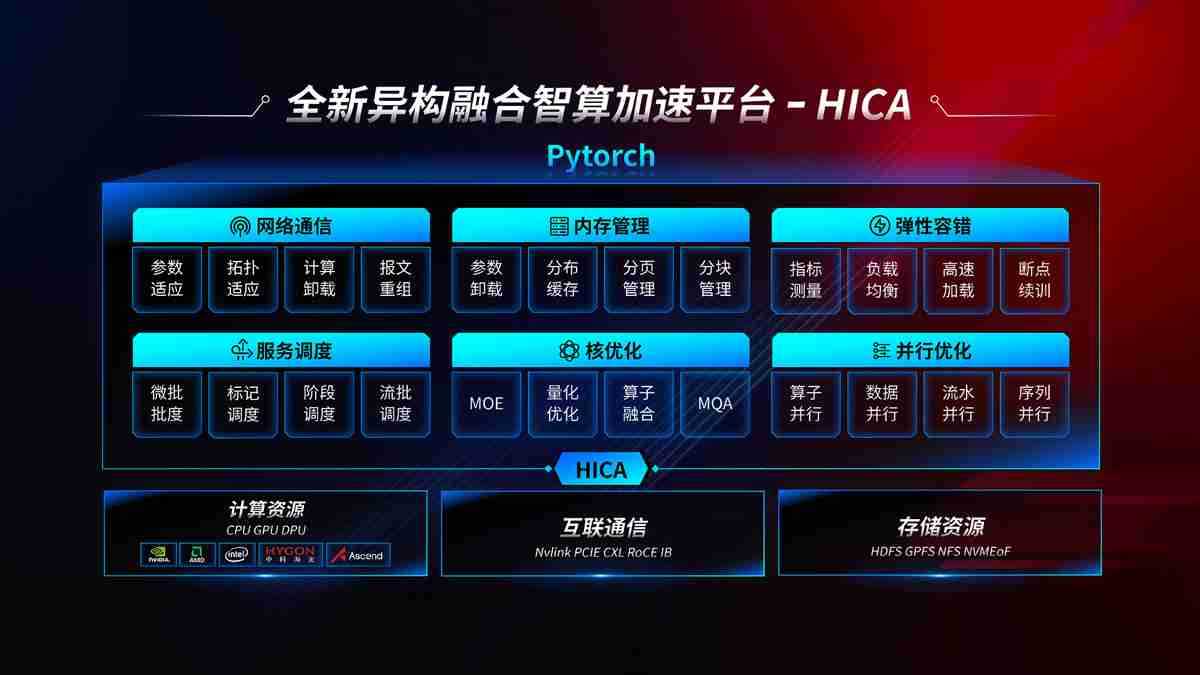 通过自研的服务层、、、中间适配层、、以及调度编排算法,,,,采用数据并行、、、模型并行等多种并行方式,,,,把并行计算任务进行有效的分解,,,,使其分别由相应的软件栈和算力资源来承接。。。当GPU资源变化,,HICA可以实时动态调度计算子任务并调整模型拓扑和架构,,,以充分聚合各种算力资源。。
